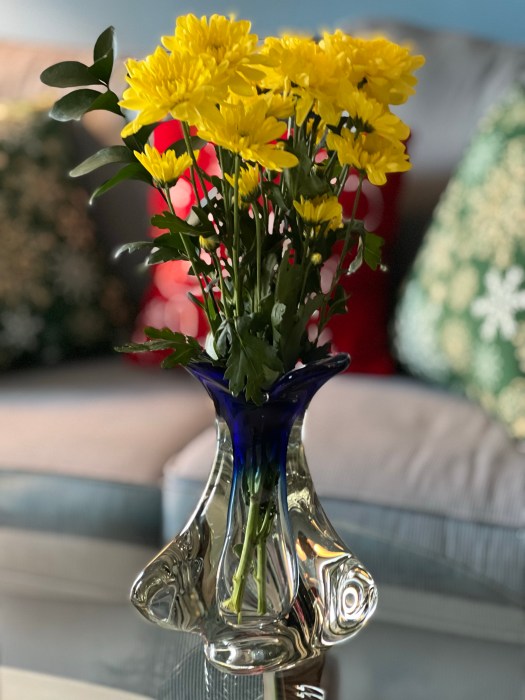 Bukiet był z wielu gatunków kwiatów. Podzieliłam je na trzy wazony. Ten piękny wazon dostałam od syna na święta. Przypłynął z Norwegii.