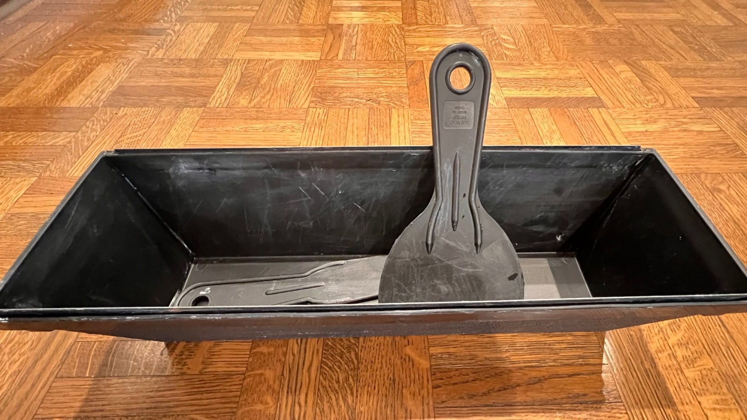 Wymyłam szpachlówki i rynienkę. Od tego jak są czyste zależy moja praca. Nie trzeba machać szpachelką kilka razy bo jakaś grudka lub paproch przeszkadza na uzyskanie idealnie płaskiej powierzchni, a tylko raz a ewentualnie dwa pociągnięcia.