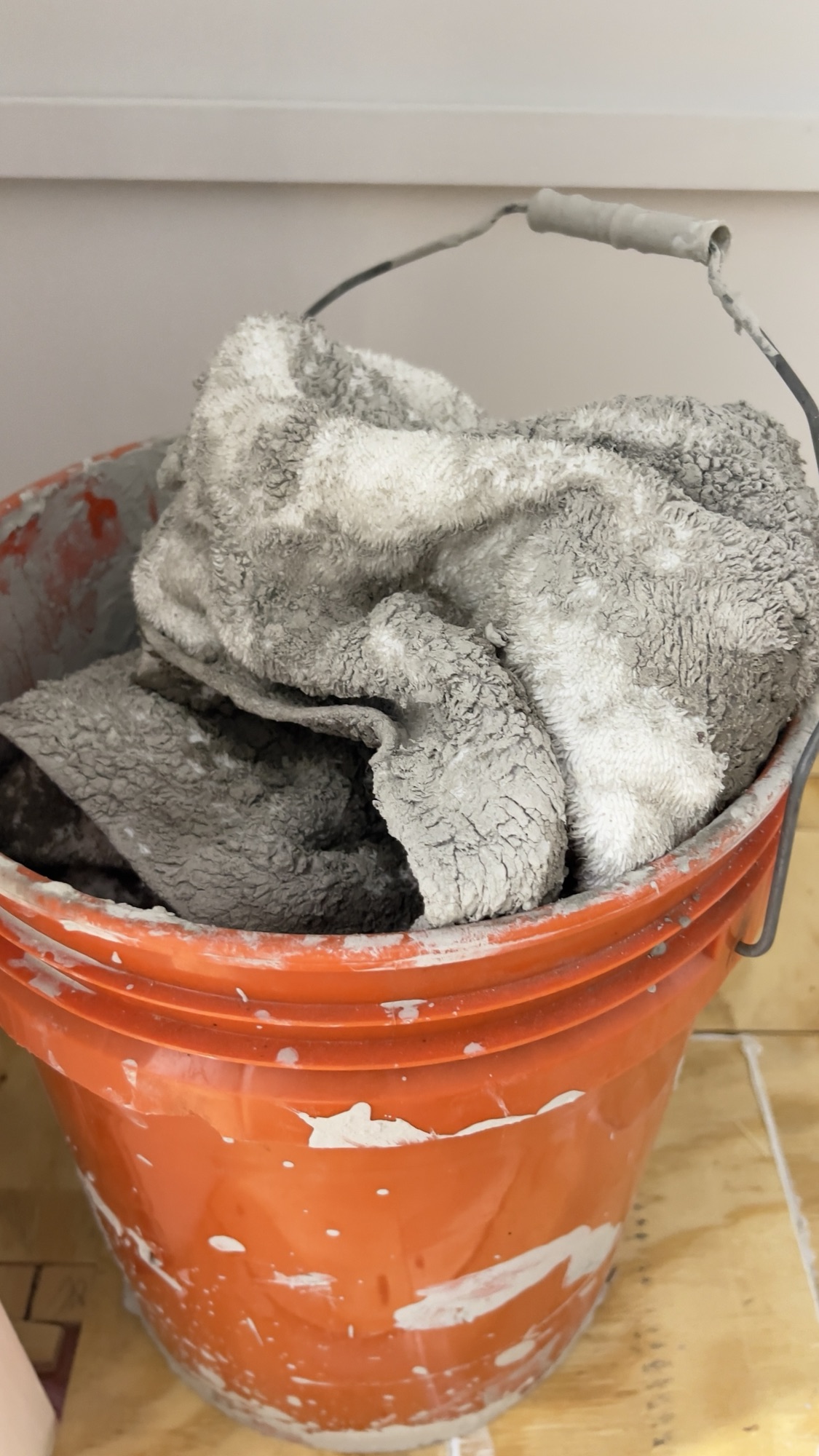 Wróciłam do zaprawy cementowej tym razem naciskałam troszeczkę i myślałam, że zaprawa jest ok ale ona nie była nawet ok to była tragedia i tę tragedię wylałam pól wiadnra na podłogę. Wylałam coś co było już nie do użycia. Pełno wielkich i małych klusek które nie współpracowały ze mną. To co było rzadkie rozpłynęlo sie po podłodze, ale to mi wogóle nie pomogło. Zastygało w kosmicznym tempie. A ja biegałam po następne ręczniki aby to ściągnąć z podłogi bo jeśli bym zostawiła musiałabym chyba młotem pneumatycznym zrywać. Rękawice miałam brudne i ociekające cementem który zastygał. To była walka z czasem, już bez rękawic gołymi rękoma ściągałam cement najwięcej ile mogłam.