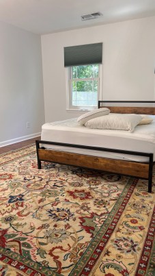Udało się. Skręciłam łóżko, przy pomocy MM położyliśmy ogromnie ciężki materac, postawiłam szafkę nocną. Założyłam czystą pościel i jest… temporary/tymczasowa sypialnia.