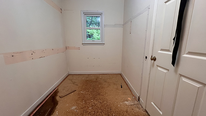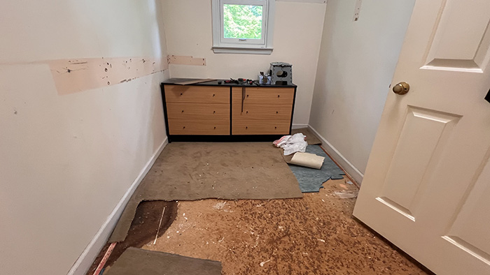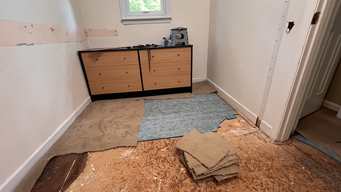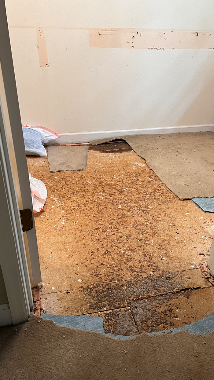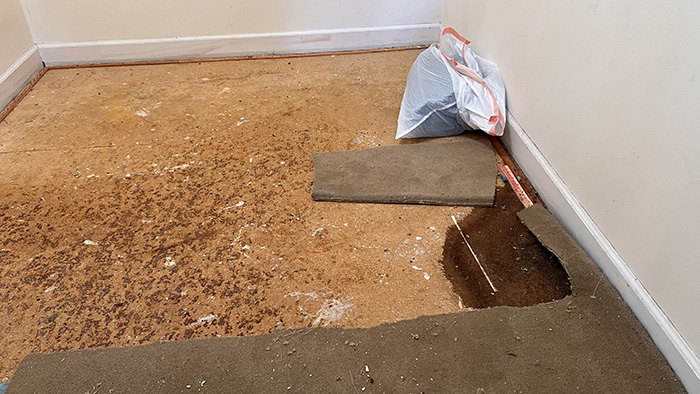 Grudki brązowe które były pod wykładziną, podejrzewamy że to jest klej od pierwotnej wykładziny. Podobnie jak w każdym pokoju, zdejmowałam szpachelką. Plama przy ścianie to podejrzewamy, że to był stary zaciek. Trochę to się kruszy ale płyty zdejmować/wymieniać nie nie będę, zaleję zaprawą cementową. Jeszcze nie sprawdzałam poziomu podłogi, jak na razie wygląda na OK.
